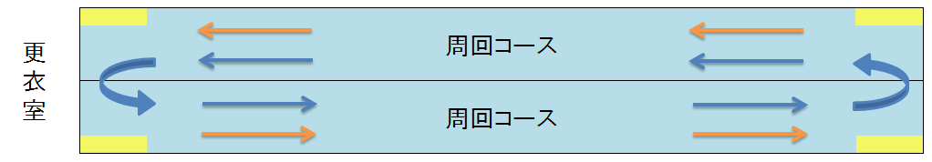 矢印のコースで遊泳ください。コース内では立ち止まってはいけません。