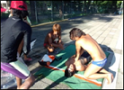 開館前にプール表面の網かけを行い、プールに入った葉っぱや虫などを取り除いています。