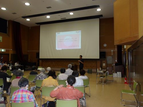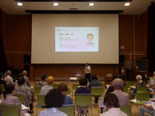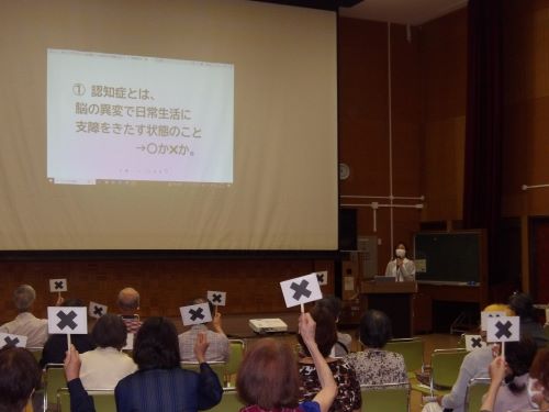 四街道市役所高齢者支援課の方から認知症に関する基本的なことについて、〇✕で答えるクイズ形式で教えていただきました。また、四街道市で行っている「スマイルボランティア事業」について説明していただきました。