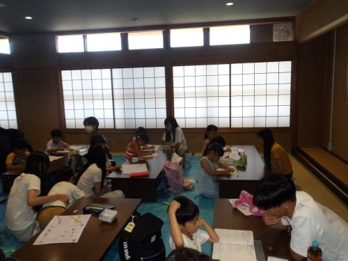 午前の部の「学習タイム」では、ボランティアと一緒に夏休みの宿題を中心に集中して学習に取り組みました。中には、ボランティアに相談しながら読書感想文を仕上げた小学生がいました。また、「夏休みの宿題を全部終えた」と喜んでいる小学生もいました。