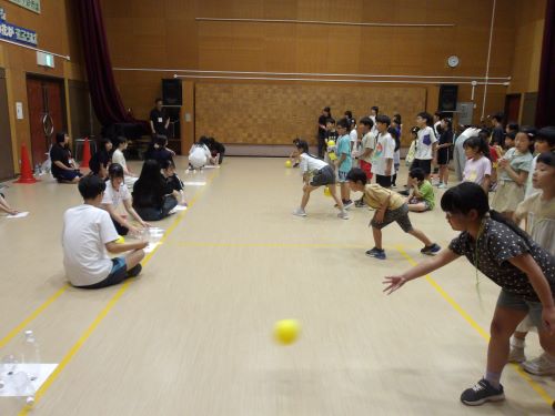 昼食休憩をはさみ、午後の部は「レク」と「運動」を行いました。1日目は公民館職員が進めましたが、2日目はボランティアが中心となって進行して、レクや運動を楽しみました。5チーム対抗で行ったレースやボーリング大会は大いにみんなで盛り上がりました。