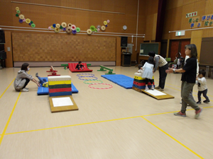 令和7年11月10日(月)に旭公民館において、親子スマイルひろばの最終回を開催しました。音楽に合わせて体を動かして体を温めた後、跳び箱やマット、平均台を使ってサーキット運動を行いました。お母さんも子供たちも広いホールで思い切り動いて楽しみました。