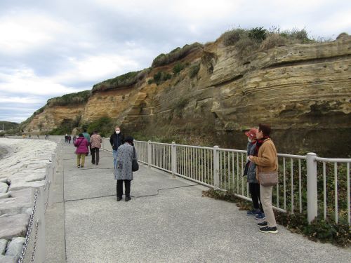 次に屏風ヶ浦を散策しました。屏風ケ浦は千葉県北東部に位置する下総台地を削る海食崖で、新第三紀鮮新世以降の地層から成る露岩の崖が約10㎞にわたって分布しており、地質学上や鑑賞上の価値が高い地形です。