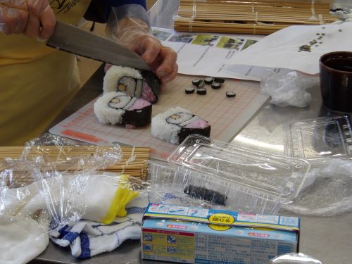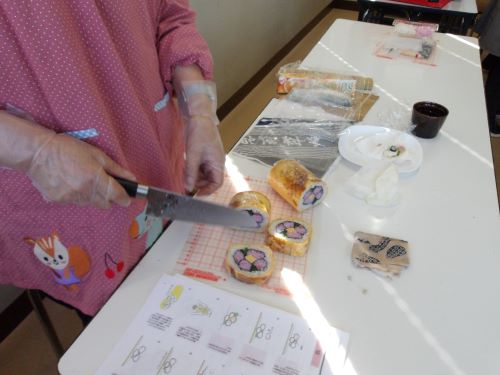 始めにサンタクロースを作りました。鼻、眉毛、帽子、ひげなど1つ1つを海苔で巻いて形を整え組み立てていきます。最後に撒きすで固めます。包丁で切ったら本当にサンタクロースになるか不安でしたが、切った後「かわいい」「サンタさんだあ」といううれしそうな声がたくさん聞こえてきました。