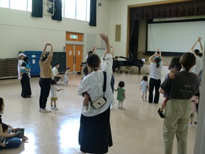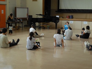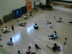 伊藤先生のピアノの伴奏に合わせ、宍倉先生の動きを真似しながら、それぞれの親子で楽しく音楽に応じて身体を動かしました。