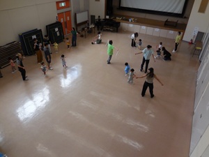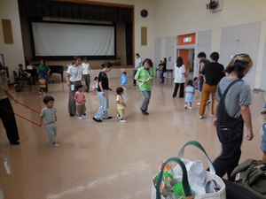 紙テープを使った電車ごっこでは、保護者と一緒に会場を駆け回っていました。