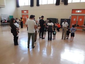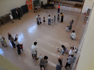 今回のテーマは「お家の人ともリトミック」と題して、リトミックがどういうものなのかと思っているご家族に知ってもらうことをねらいとし、この日は、お子さん本人以外にご両親、祖母、兄弟姉妹の計34名の参加がありました。