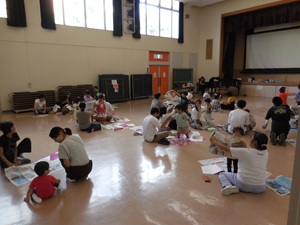 工作では、クレヨンで色紙に絵や模様をを描き、新聞紙や紙テープも使って、葉やツルのついたサツマイモを作り、音楽に合わせて、お芋掘りをしました。ご家族揃って楽しく活動していました。
