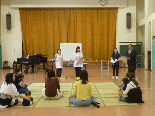 館長の挨拶では、この講座の目的として、①遊びを通して、友達作りや他の親子と交流すること、②子どもの心と体の発達を促していくこと、③親と子がふれあいを大切にしながら学習することの3点を挙げさせていただきました。