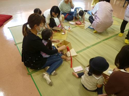 ホールの真ん中に引かれた「ござ」に保護者と幼児が輪になって座り、保護者と幼児たちは、これから使う道具箱を作ったり、様々なおゆうぎで楽しく遊びました。今日は特別にお母さんへのプレゼントづくりにも挑戦しました。