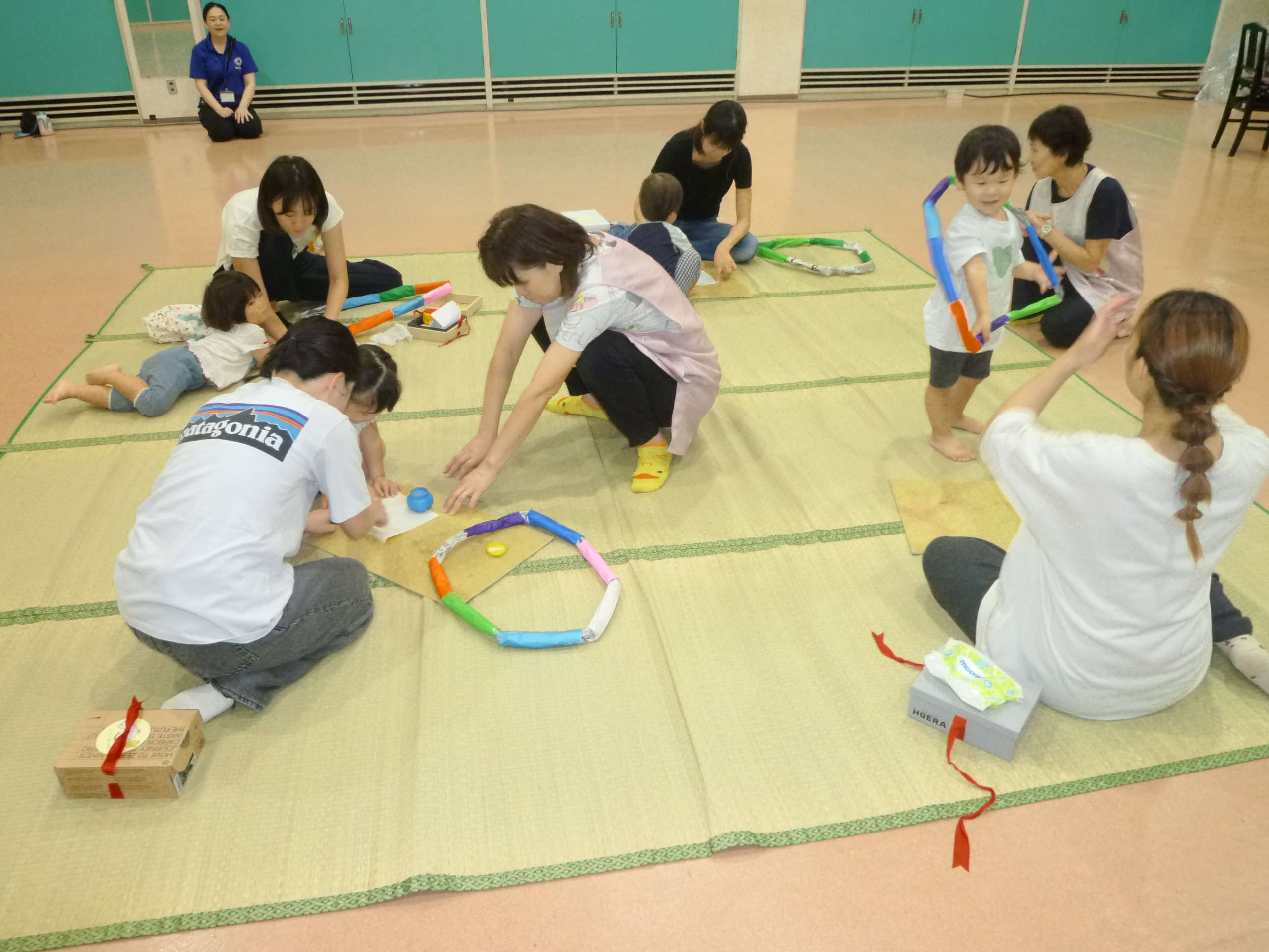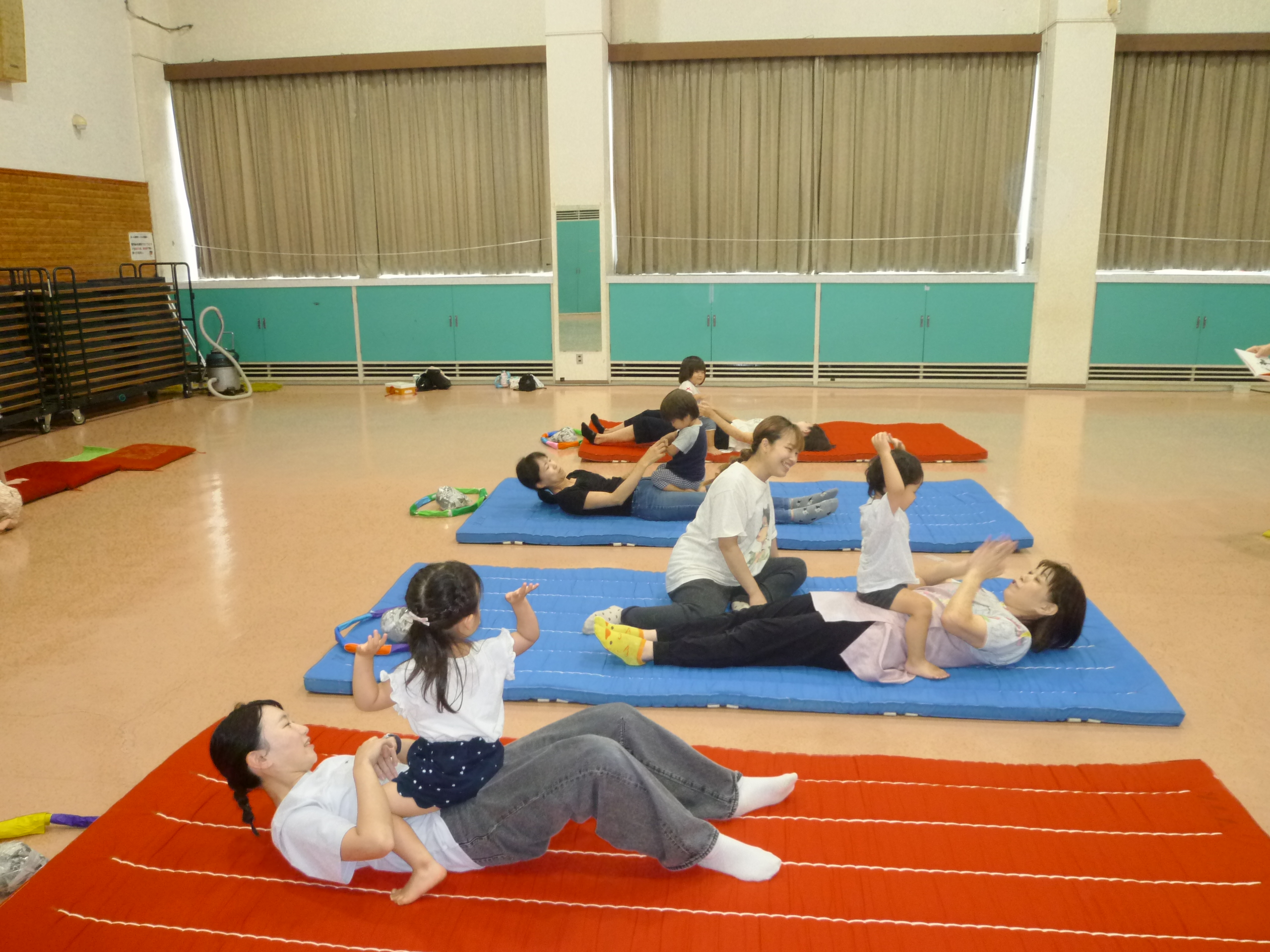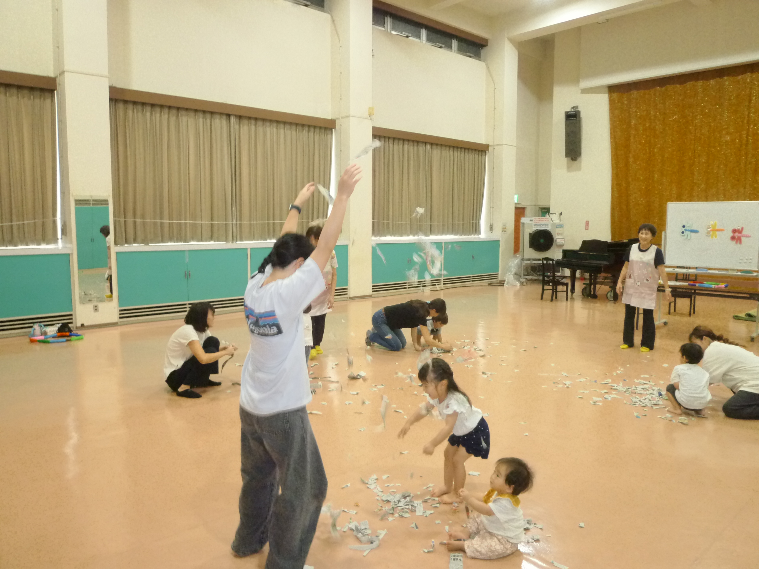 今日も「手遊びの歌」、「絵本の読み聞かせ」からスタートしました。次に、「親子体操」で本日行う、マット遊びに向けての準備運動をしました。親が広げて持った新聞紙を子どもがパンチで破る遊びです。体全体を使っての活動に子どもも少々疲れたようですが、上手にできました。破った新聞紙をさらに細かくして、全員で新聞紙のシャワーを作って大はしゃぎ。最後のマット遊びでは、体を丸めて転がったり、子どもとお母さんが抱き合いながらマットの上をゴロゴロしたりして、大はしゃぎ。スキンシップを図りながら、母子ともに楽しそうにしている姿を見て、こちらもとても癒されました。親子で充実した時間を過ごしてくれたようです。